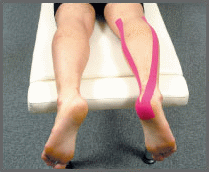 - 將醫療用貼布的離型紙撕開,先貼一端於足跟部(如圖下)