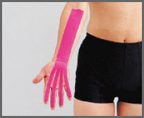 - 將醫療用貼布的離型紙撕開,先貼一端於肘橫紋內側(如圖下)